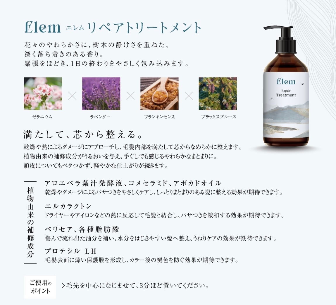 乾燥や熱によるダメージにアプローチし、毛髪内部を満たして芯からなめらかに整えます。植物由来の補修成分がうるおいを与え、手ぐしでも感じるやわらかなまとまりに。頭皮についてもベタつかず、軽やかな仕上がりが続きます。